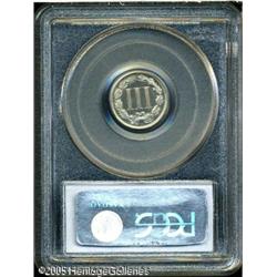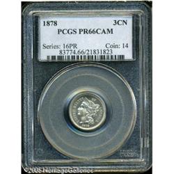 <B>1878 3CN PR66 Cameo PCGS.</B></I> This even higher graded striking also shows the "broken nose" on Liberty from overly vigorous die polishing, and the fields are equally as deep in their mirrored reflectivity. However, they appear more subdued because of the light, streaky golden toning seen on each side. Both obverse and reverse appear to be free from any traces of carbon spotting. Population: 44 in 66, 4 finer (1/05). Lot:5809