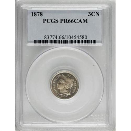 <B>1878 3CN PR66 Cameo PCGS.</B></I> Honey-gold toning graces this meticulously struck and splendidly smooth Premium Gem. A proof-only date, and a semi-key to the series. Population: 54 in 66 Cameo, 6 finer (6/07).<BR><BR><b>Shipping:</b> Coins & Currency (<a target="_blank" href="http://www.heritageauctions.com/common/shipping.php">view shipping information</a>\)