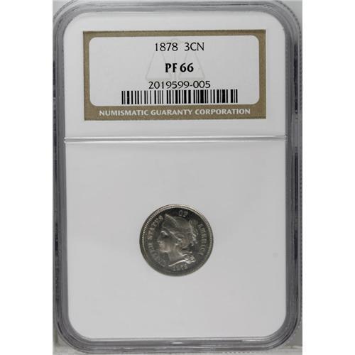 <B>1878<3CN> PR66 NGC.</B></I> A splendid Gem proof with sharp design features and pleasing medium gray color. The fields are moderately reflective, as often seen on this proof-only issue.