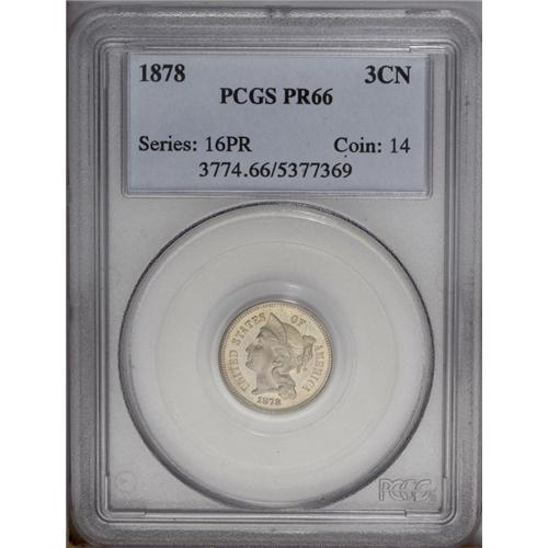 <B>1878<3CN> PR66 PCGS.</B></I> Iridescent lemon and powder-blue tints enrich this intricately struck and impressively preserved Premium Gem. A proof-only issue that, like the present piece, often comes with satiny luster.