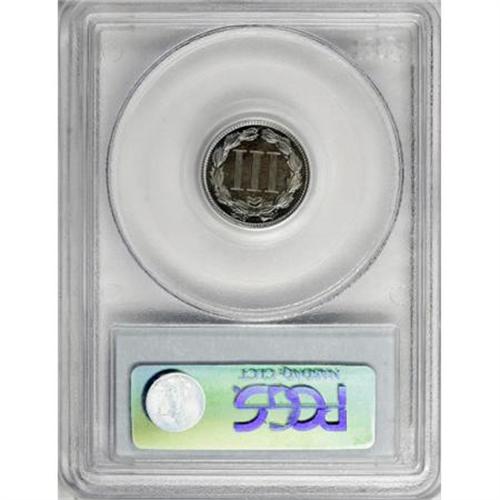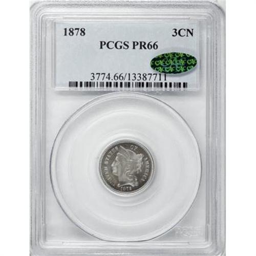 <B>1878 3CN PR66 PCGS. CAC.</B></I> A satiny and delightful specimen from this proof-only issue, well-defined with vibrant sapphire and blue-green patina over each side. Beautifully preserved and visually appealing.<BR><BR><B>Coin Engraver:</B> James B. Longacre<BR><BR><b>Shipping:</b> Coins & Currency (<a target="_blank" href="http://www.heritageauctions.com/common/shipping.php">view shipping information</a>)