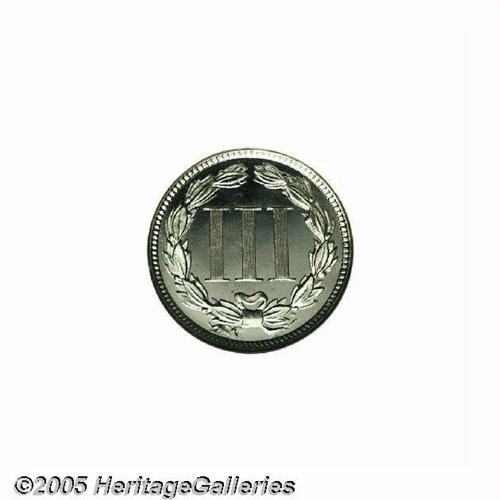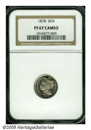 <B>1878<3CN> PR67 Cameo NGC.</B></I> Mostly brilliant with a shimmering glow and ample contrast emanating from both sides. Precious few specimens from this proof-only year could possibly compete with the total package of this Superb Gem. Population: 12 in 67 Cameo, 0 finer (6/05).