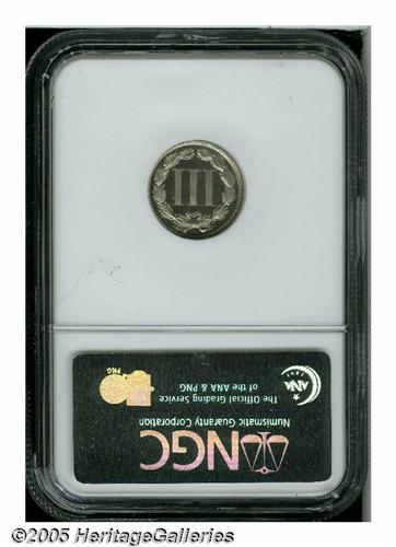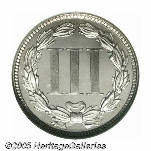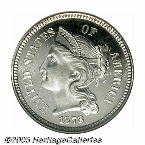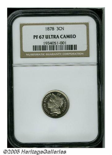 <B>1878<3CN> PR67 Ultra Cameo NGC.</B></I> The portrait has exceptional cameo frost, and the remainder of the devices and legends also exhibit strong white on black distinction. Meticulously struck and nearly immaculate, this untoned proof-only specimen can be identified by a tiny planchet flaw near the southwest corner of the first denomination pillar. The present piece is the only 1878 Three Cent Nickel to receive an Ultra Cameo definition from NGC. PCGS has certified just a single specimen as Deep Cameo, at the PR65 level.