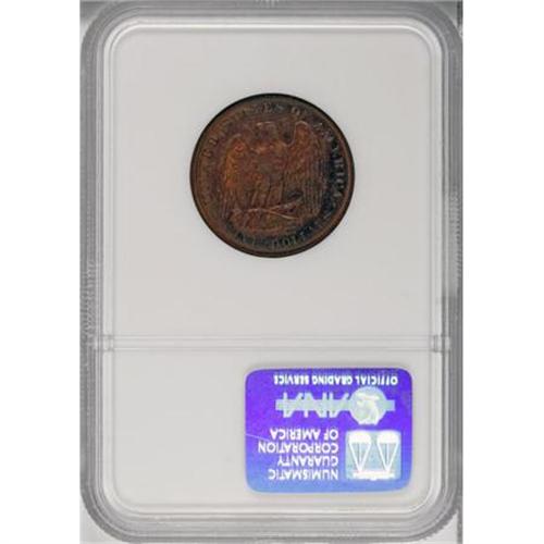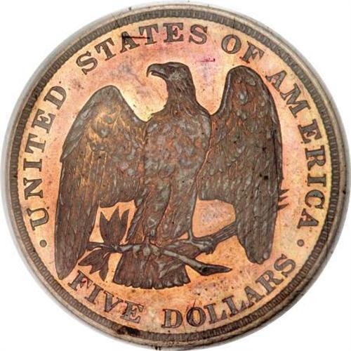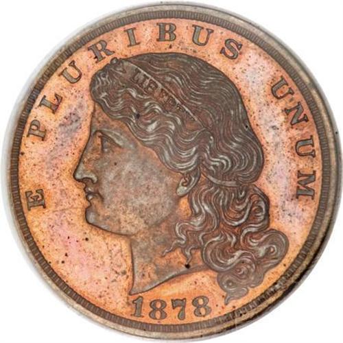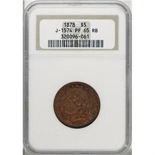 <B>1878 $5 Five Dollar, Judd-1574, Pollock-1766, R.6, PR65 Red and Brown NGC.</B></I> William Barber's design shows the head of Liberty and wears a band inscribed LIBERTY incused with E PLURIBUS UNUM around the margin. This portrait is similar in design to the famous Flowing Hair stella. The reverse has an erect eagle with raised wings. Struck in copper with a reeded edge. Struck on a wider planchet than a normal half eagle. Approximately 18 pieces are known and several have gilt surfaces. This is a lovely piece that is mostly red still with just a slight bit of mellowing. Well, but not completely struck because of die opposition. A few tiny specks of carbon are scattered over each side.<BR><BR><b>Shipping:</b> Coins & Currency (<a target="_blank" href="http://www.heritageauctions.com/common/shipping.php">view shipping information</a>)