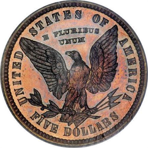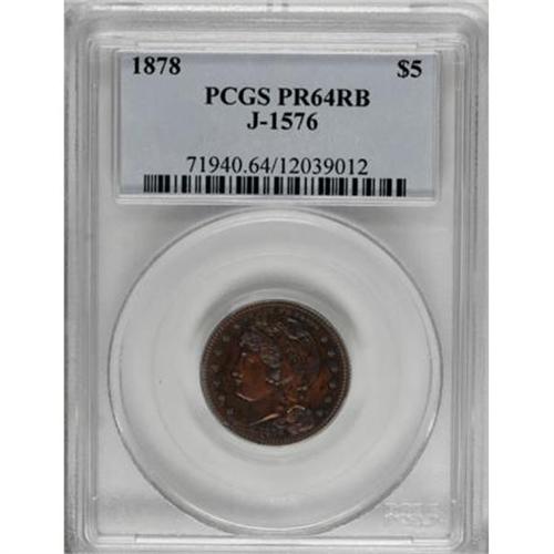 <B>1878 $5 Five Dollar, Judd-1576, Pollock-1769, R.6-7, PR64 Red and Brown PCGS.</B></I> A head of Liberty faces left with IN GOD WE TRUST above, and the date 1878 below. Liberty is wearing a large cap inscribed LIBERTY and it is ornamented with 2 wheat ears. There are 13 stars at the border arranged 7 left and 6 right. An eagle with upraised wings is seen on the reverse. E PLURIBUS UNUM is expressed in two lines over the eagle's head. This design is attributed to William Barber who was impressed with Gobrecht's sketches of the 1830s. Struck in copper with a reeded edge. About a dozen pieces are known in copper with several that have been gilt. This Red and Brown example is long on the Red and short on the Brown. Most of each side is rich cherry-red with an accent of brown around the devices. A trace of a fingerprint is seen on the lower left portion of the obverse, which should prove a ready identifier if someone should wish to trace the pedigree of this important pattern.<BR><I>From The Pelican Bay Collection of Pattern Coins.</B></I><BR><BR><b>Shipping:</b> Coins & Currency (<a target="_blank" href="http://www.heritageauctions.com/common/shipping.php">view shipping information</a>)