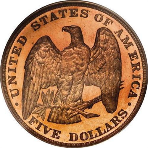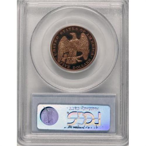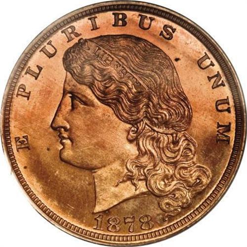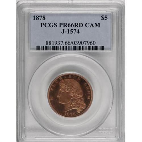 <B>1878 $5 Five Dollar, Judd-1574, Pollock-1766, High R.6, PR66 Red Cameo PCGS.</B></I> William Barber's design that shows the head of Liberty wearing a band inscribed LIBERTY incused with E PLURIBUS UNUM around the margin. This portrait is similar in design to the famous $4 Flowing Hair Stella pattern. The reverse has an alert perched eagle with raised wings. Struck in copper with a reeded edge.<BR> This is an outstanding brick-red Premium Gem. The strike is absolute, and the color is seamless aside from a couple of unimportant gray flecks. Careful rotation fails to discover any hairlines. PCGS has certified six pieces across all grades, with the present piece as the single finest (10/07).<BR><I>From The Pelican Bay Collection of Pattern Coins.</B></I><BR><BR><b>Shipping:</b> Coins & Currency (<a target="_blank" href="http://www.heritageauctions.com/common/shipping.php">view shipping information</a>)