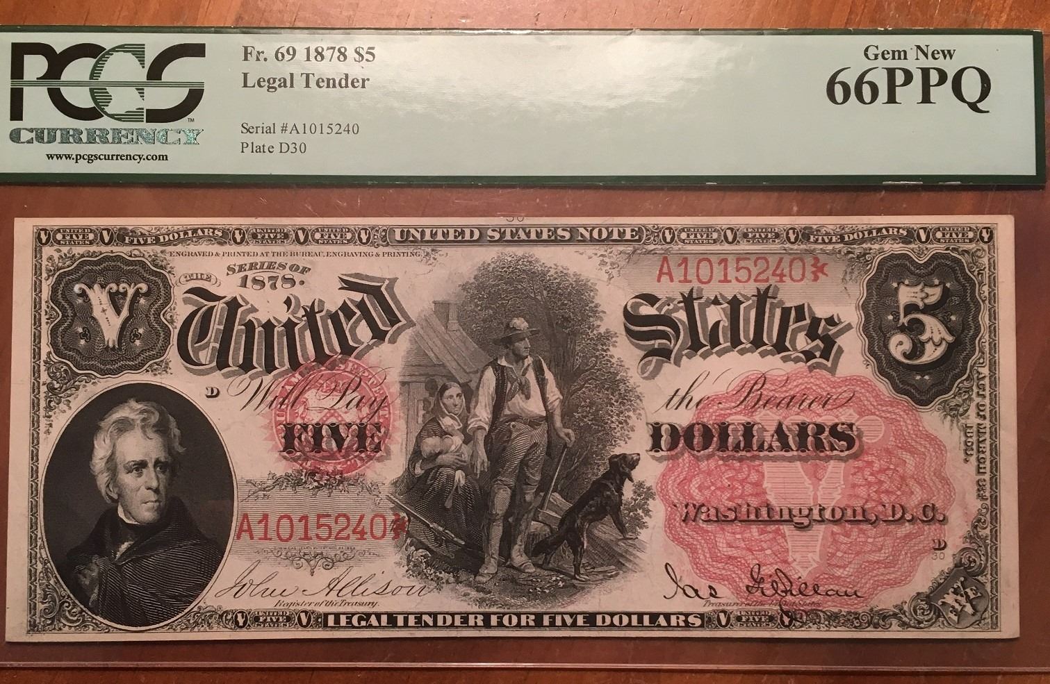 One 1878 $5 Legal Tender Note PCGS 66PPQ.