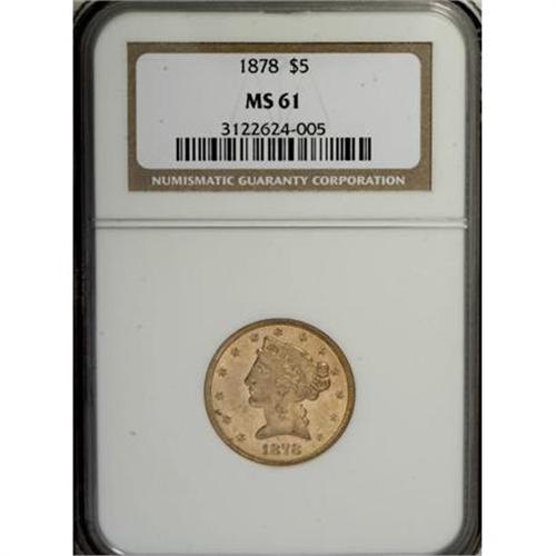 <B>1878 $5 MS61 NGC.</B></I> . NGC Census: (66/67). PCGS Population (19/58). Mintage: 131,740. Numismedia Wsl. Price for NGC/PCGS coin in MS61: $400. (#8345)<BR><BR><B>Coin Engraver:</B> Christian Gobrecht<BR><BR><b>Shipping:</b> Coins & Currency (<a target="_blank" href="http://www.heritageauctions.com/common/shipping.php">view shipping information</a>)