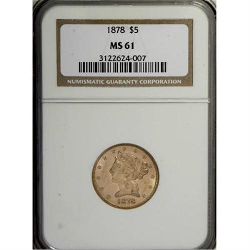 <B>1878 $5 MS61 NGC.</B></I> . NGC Census: (66/67). PCGS Population (19/58). Mintage: 131,740. Numismedia Wsl. Price for NGC/PCGS coin in MS61: $400. (#8345)<BR><BR><B>Coin Engraver:</B> Christian Gobrecht<BR><BR><b>Shipping:</b> Coins & Currency (<a target="_blank" href="http://www.heritageauctions.com/common/shipping.php">view shipping information</a>)