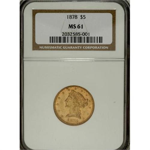 <B>1878 $5 MS61 NGC.</B></I> NGC Census: (66/67). PCGS Population (19/59). Mintage: 131,740. Numismedia Wsl. Price for NGC/PCGS coin in MS61: $400. (#8345)<BR><BR><B>Coin Engraver:</B> Christian Gobrecht<BR><BR><b>Shipping:</b> Coins & Currency (<a target="_blank" href="http://www.heritageauctions.com/common/shipping.php">view shipping information</a>)