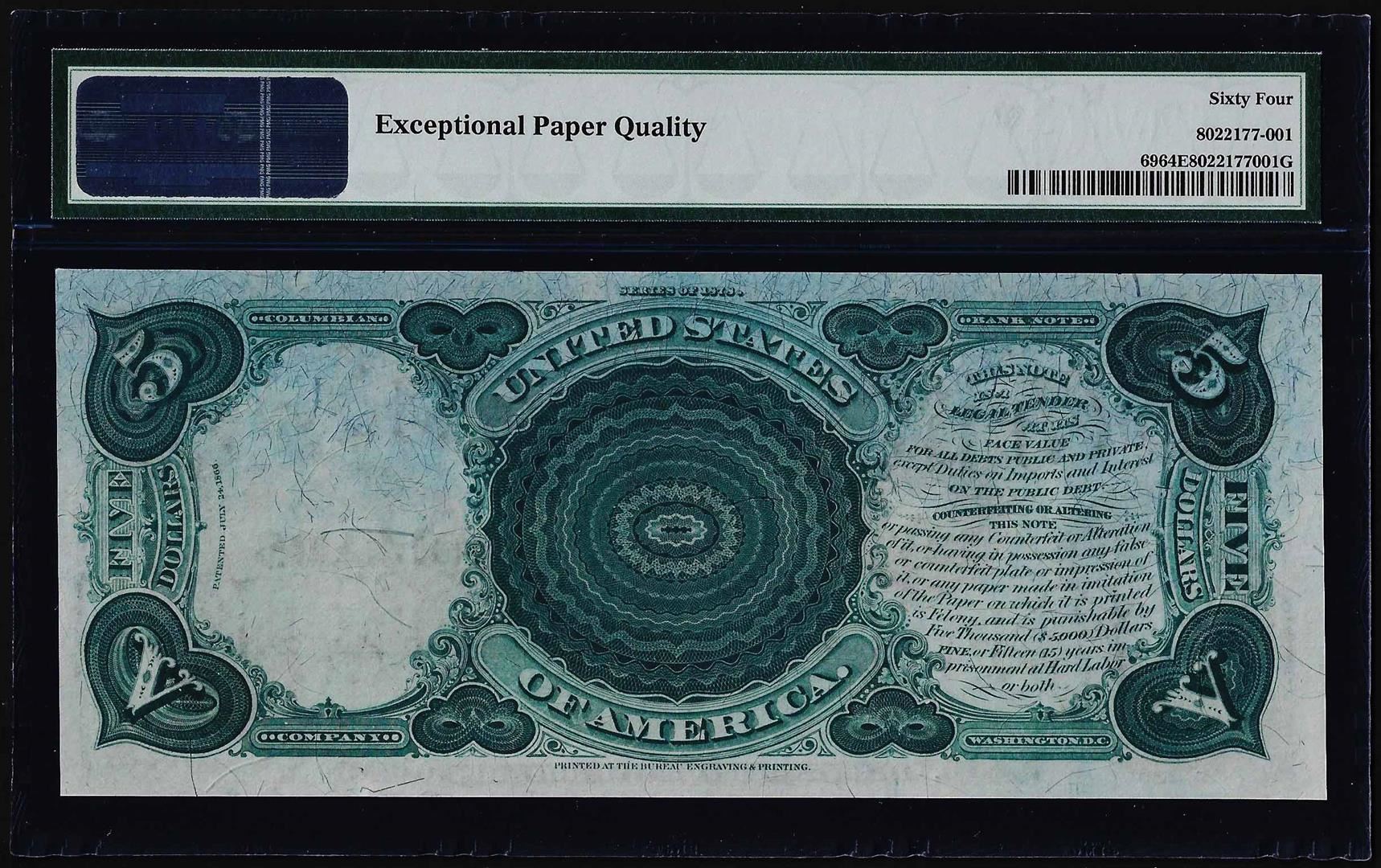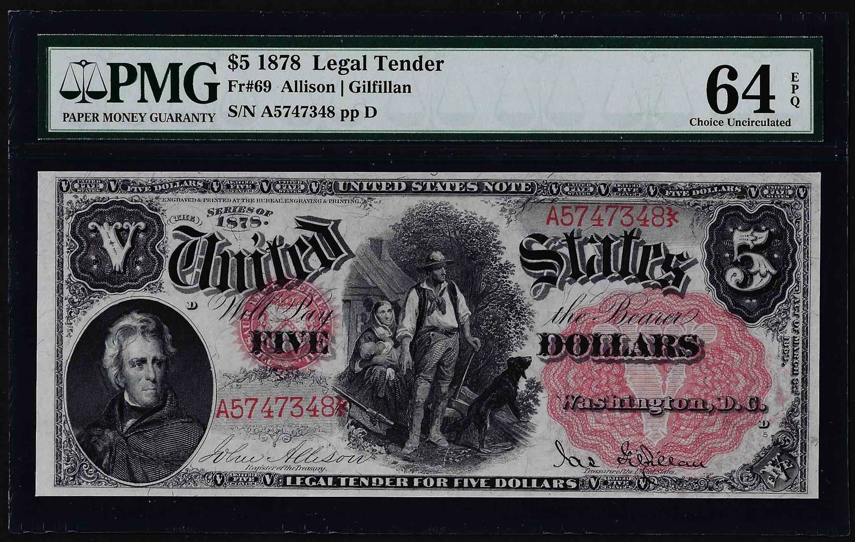 One 1878 $5 Woodchopper Legal Tender Note Fr.69 PMG Choice Uncirculated 64EPQ. PMG Certified.