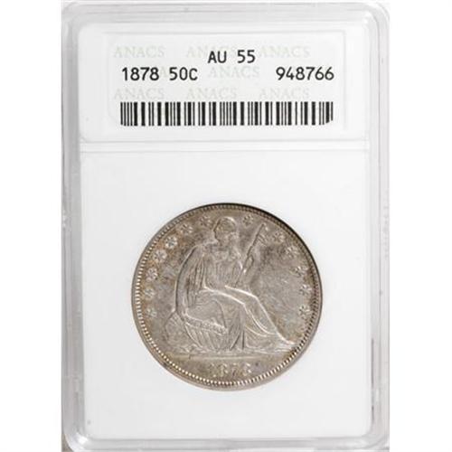 <B>1878 50C AU55 ANACS.</B></I> NGC Census: (6/56). PCGS Population (7/67). Mintage: 1,378,400. Numismedia Wsl. Price for NGC/PCGS coin in AU55: $260. (#6358)<BR><BR><B>Coin Engraver:</B> Christian Gobrecht<BR><BR><b>Shipping:</b> Coins & Currency (<a target="_blank" href="http://www.heritageauctions.com/common/shipping.php">view shipping information</a>)
