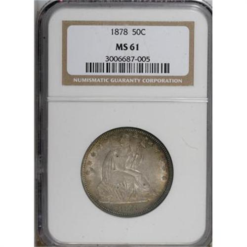 <B>1878 50C MS61 NGC.</B></I> NGC Census: (3/41). PCGS Population (2/52). Mintage: 1,378,400. Numismedia Wsl. Price for NGC/PCGS coin in MS61: $525. (#6358)<BR><BR><B>Coin Engraver:</B> Christian Gobrecht<BR><BR><b>Shipping:</b> Coins & Currency (<a target="_blank" href="http://www.heritageauctions.com/common/shipping.php">view shipping information</a>)