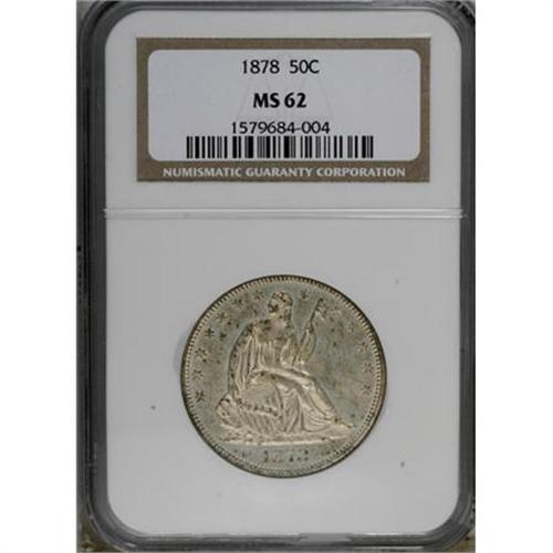 <B>1878 50C MS62 NGC.</B></I> Both sides display significant reflectivity beneath rich silver-white patina that shows scattered flecks of tan-gold. Crisply struck with surprisingly few abrasions for the grade assigned and excellent overall eye appeal. Census: 7 in 62, 37 finer (1/08).<BR><BR><B>Coin Engraver:</B> Christian Gobrecht<BR><BR><b>Shipping:</b> Coins & Currency (<a target="_blank" href="http://www.heritageauctions.com/common/shipping.php">view shipping information</a>)