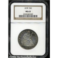 <B>1878<50C> MS63 NGC.</B></I> Type Two Reverse. A mildly prooflike piece that has pleasing tobacco-brown and electric-blue colors. Not fully struck in the centers, but the stars and Liberty's head are bold. Scarce in Mint State. Population: 10 in 63, 28 finer (5/04). <BR><BR><B>Important notice:</B> Heritage usually auctions material at the rate of 200-250 lots per hour. On some occasions eBay Live bid software or the Internet may not be able to keep up with the pace of the auction. We recommend placing a realistic absentee bid now as insurance to avoid disappointment. Occasionally the auctioneer may eliminate or reject an eBay Live bid, and the auctioneer may also reopen a lot after the close of the eBay live bidding (usually because we missed an audience bid), and may reject your bid even if it shows you as the winning bidder. By bidding via eBay Live, you agree that Heritage may award the lot to another bidder at its sole discretion under the circumstances described above or any other reasonable circumstances. Since eBay bids are not shown to us until we open the lot on the floor, we treat those bids just like floor bids. In most cases the floor responds before the eBay bid is presented to us, due to Internet lag time, so for consistency we have made it a policy that floor bids are always considered first over tie eBay live bids. Also please note that all Heritage lots purchased through eBay Live carry a 20% Buyer's Premium. Please make sure you read the Terms and Conditions before you bid.