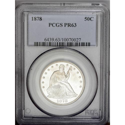 <B>1878<50C> PR63 PCGS.</B></I> Type Two Reverse. Traces of golden patina visit the central obverse of this predominantly untoned specimen. The devices are lightly frosted. Faint field hairlines are appropriate for the grade. Just 800 proofs were struck.