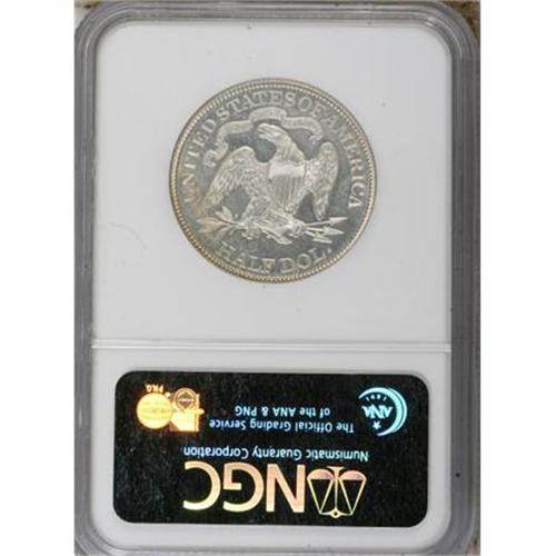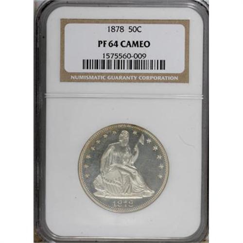 <B>1878 50C PR64 Cameo NGC.</B></I> Type Two Reverse. Sharply struck with plenty of flash and strong contrast despite an even layer of silver-gray patina over each side. Delicate champagne toning accents the left obverse and reverse as well. A lovely later Seated half proof. Census: 18 in 64 Cameo, 14 finer (10/07).<BR><BR><b>Shipping:</b> Coins & Currency (<a target="_blank" href="http://www.heritageauctions.com/common/shipping.php">view shipping information</a>)