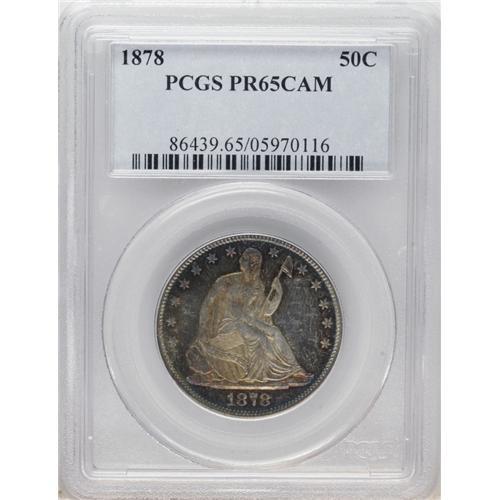 <B>1878 50C PR65 Cameo PCGS.</B></I> Type Two Reverse. One of the more popular dates in the Seated half series, both as a business strike and a proof. The cameo contrast is abundantly evident even through the vivid golden-russet toning that covers much of each side. The margins are framed with cobalt-blue and translucent because of the depth of the mirrors. A bright and attractive proof striking that will surely find an appreciative home, most likely as a type coin. Population: 2 in 65, 5 finer (1/07).<BR><BR><b>Shipping:</b> Coins & Currency (<a target="_blank" href="http://www.heritageauctions.com/common/shipping.php">view shipping information</a>)