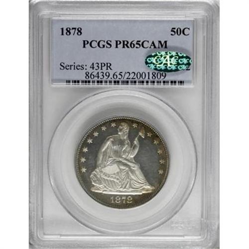 <B>1878 50C PR65 Cameo PCGS. CAC.</B></I> Type Two Reverse. Peripheral cobalt-blue, purple, and golden-tan patina embrace both sides of this magnificent Gem proof Cameo, and a well executed strike brings out uniformly sharp definition on the design features. The few minor hairlines interspersed among die polish lines preclude a possibly higher grade. Population: 3 in 65 Cameo, 5 finer (11/07).<BR><I>From The Kallenberg #1 PCGS Registry Set Of Proof Half Dollars.</B></I><BR><BR><b>Shipping:</b> Coins & Currency (<a target="_blank" href="http://www.heritageauctions.com/common/shipping.php">view shipping information</a>)
