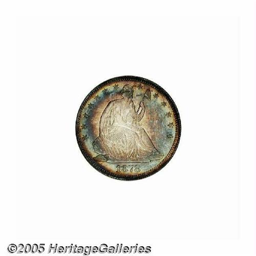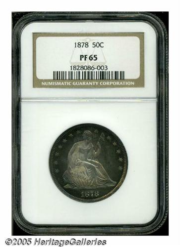 <B>1878<50C> PR65 NGC.</B></I> Type Two Reverse. Beautiful bands of rose, gold, and aquamarine color illuminate the obverse. The reverse displays consistent deep dove-gray patination. Well struck, only the left (facing) claw does not offer complete definition, since Liberty's hair and the nearby stars are fully brought up by the dies. A few nearly invisible hairlines are on the right obverse field. Liberty has only partial drapery beneath the elbow, and the obverse has a pronounced wire rim between 1 and 7 o'clock, all as made. A scant 800 pieces were struck. Population: 25 in 65, 11 finer (6/05).