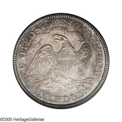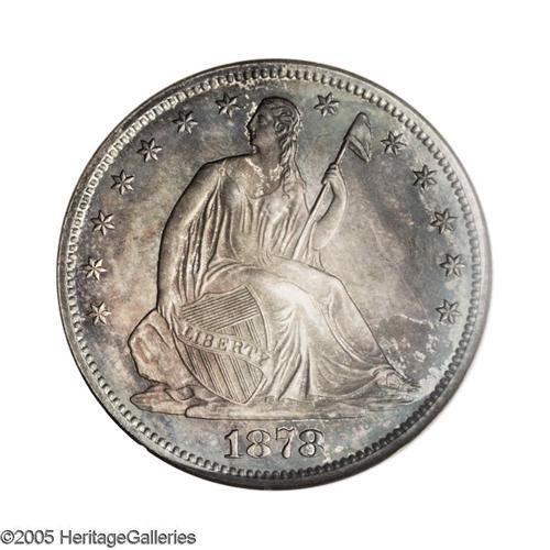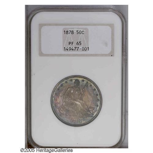 <B>1878<50C> PR65 NGC.</B></I> Type Two Reverse. Vivid olive-gold, rose-red, plum, and aquamarine colors embrace this crisply struck and undisturbed Gem. 1878 was the final year of large scale business strike production for the series, since the mints thereafter concentrated on Silver Dollars until 1892. A mere 800 proofs were struck.