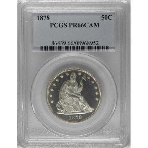 <B>1878 50C PR66 Cameo PCGS.</B></I> Type Two Reverse. This is an amazing proof representative that reveals pristine surfaces and outstanding striking details on each side. The deep pools of reflectivity in the fields provide an ideal backdrop for magnificent cameo contrast with the heavily frosted, icy-white devices. A great Premium Gem proof. Population: 5 in 66 Cameo, 0 finer (3/07).<BR><BR><b>Shipping:</b> Coin/Currency (<a target="_blank" href="http://www.heritageauctions.com/common/shipping.php">view shipping information</a>)