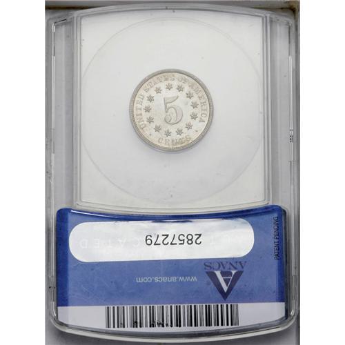 <B>1878<5C> PR62 ANACS.</B></I> A proof-only issue, but in this case the surfaces have satiny luster with little reflectivity. This is a typical appearance for 1878 Shield nickels. Both sides have light gray surfaces with hints of gold toning. Noticeable hairlines on the reverse account for the grade of this example.