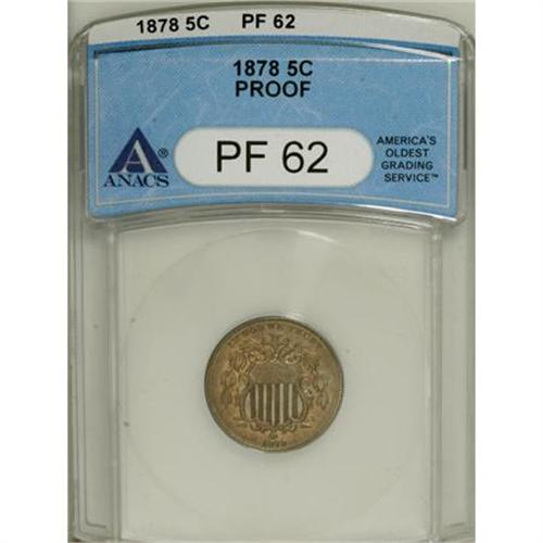 <B>1878 5C PR62 ANACS.</B></I> Rose-gold and olive-green toning confirms the originality of this satiny specimen. Sharply struck save for minor blending on a few of the horizontal shield lines. A small spot is noted near the M in AMERICA. A popular proof-only date.<BR><BR><b>Shipping:</b> Coins & Currency (<a target="_blank" href="http://www.heritageauctions.com/common/shipping.php">view shipping information</a>)