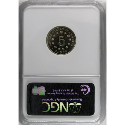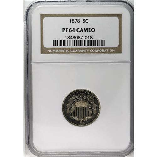 <B>1878<5C> PR64 Cameo NGC.</B></I> A near-Gem with excellent contrast for this proof-only issue. Emerald toning around the rims matches a subtle blush of rose on the shield. Small dark spots pepper both sides.<BR><I>Ex: Stack's, 2/51, lot 85.</B></I><BR><I>From The Redfjord Collection.</B></I>