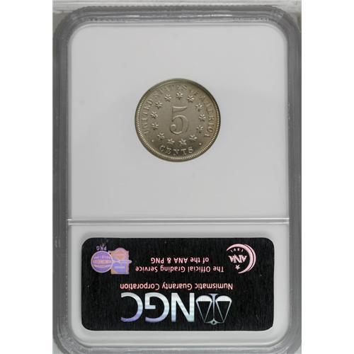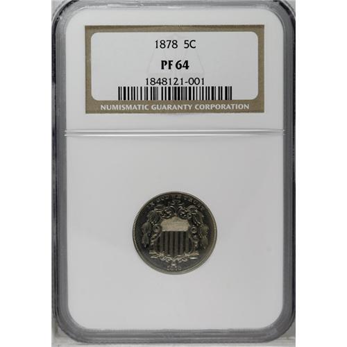 <B>1878<5C> PR64 NGC.</B></I> A lovely near-Gem with fully mirrored fields, unlike so many examples that have satiny surfaces. Sharply struck with pale gold color on each side.