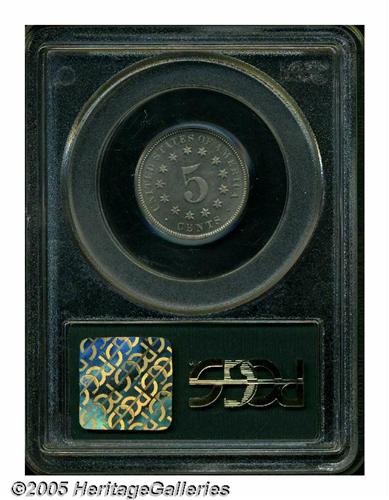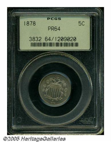 <B>1878<5C> PR64 PCGS.</B></I> Light olive-gray toning visits this well struck near-Gem. A couple of tiny toning flecks do not distract. A proof-only date. Certified in a green label holder.