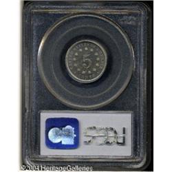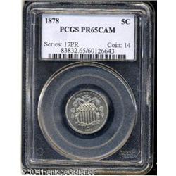 1878 5C PR65 Cameo PCGS. The final 8 in the date i <B>1878 5C PR65 Cameo PCGS.</B></I> The final 8 in the date is lightly recut. A boldly struck specimen with reasonable contrast and light gold and sea-green hues. Well preserved and attractive, and a scarce issue with any Cameo contrast. Population: 4 in 65, 11 finer (10/04). <BR><BR><B>Important notice:</B> Heritage usually auctions material at the rate of 200-250 lots per hour. On some occasions eBay Live bid software or the Internet may not be able to keep up with the pace of the auction. We recommend placing a realistic absentee bid now as insurance to avoid disappointment. Occasionally the auctioneer may eliminate or reject an eBay Live bid, and the auctioneer may also reopen a lot after the close of the eBay live bidding (usually because we missed an audience bid), and may reject your bid even if it shows you as the winning bidder. By bidding via eBay Live, you agree that Heritage may award the lot to another bidder at its sole discretion under the circumstances described above or any other reasonable circumstances. Since eBay bids are not shown to us until we open the lot on the floor, we treat those bids just like floor bids. In most cases the floor responds before the eBay bid is presented to us, due to Internet lag time, so for consistency we have made it a policy that floor bids are always considered first over tie eBay live bids. Also please note that all Heritage lots purchased through eBay Live carry a 20% Buyer's Premium. Please make sure you read the Terms and Conditions before you bid. This lot is being auctioned in conjunction with a live floor auction by Heritage Galleries & Auctioneers. All final auction and invoice information will be supplied by Heritage Galleries & Auctioneers, and all other information should be considered preliminary. Lot:5511