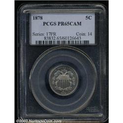 <TABLE cellSpacing=0 cellPadding=0 width="100%" bgColor=#000000 border=0><TBODY><TR><TD width="100%"><TABLE cellSpacing=1 cellPadding=3 width="100%" border=0><TBODY><TR><TD width="100%" bgColor=#79735c><FONT face=arial color=#ffffff size=3><B>Description</B> </FONT></TD></TR><TR><TD width="100%" bgColor=#ffffff><FONT face=arial size=2><B>1878 5C PR65 Cameo PCGS.</B></I> The final 8 in the date is lightly recut. A boldly struck specimen with reasonable contrast and light gold and sea-green hues. Well preserved and attractive, and a scarce issue with any Cameo contrast. Population: 3 in 65 as Cameo, 4 finer (4/03). </FONT></TD></TR></TBODY></TABLE></TD></TR></TBODY></TABLE><BR><A name=PricesRealized></A><TABLE cellSpacing=0 cellPadding=0 width="100%" bgColor=#000000 border=0><TBODY><TR><TD width="100%"><TABLE cellSpacing=1 cellPadding=3 width="100%" border=0><TBODY><TR><TD width="100%" bgColor=#79735c><A name=PR><FONT face=arial color=#ffffff size=3><B>Previous Prices from Heritage Auctions</B> </FONT></A></TD></TR><TR><TD bgColor=#f6f6ed><TABLE cellSpacing=0 cellPadding=0 width="100%" border=1><TBODY><TR><TD align=middle width="33%"><B>Date</B></TD><TD align=middle width="33%"><B>Service</B></TD><TD align=middle width="33%"><B>Price</B></TD></TR><TR bgColor=whitesmoke><TD width="33%"><B>06/08/2002</B></TD><TD width="33%">PCGS</TD><TD width="33%">$1,207.50</TD></TR></TBODY></TABLE></TD></TR><TR><TD bgColor=#ffffff><FONT face=arial size=1 ?>PLEASE NOTE: All prices realized reflect the final hammer price PLUS the buyer's premium in auctions that charge a buyer's premium. Each item has a notation at the top of the listing indicating whether that lot included a buyer's premium. Example: A item that sells with a final hammer price of $100 and a 20% buyer's premium will display with a price realized of $120. All information listed is intended to be as accurate as possible, but errors are possible. Please use this guide carefully and inform us of any inaccuracies. </FONT></TD></TR></TBODY></TABLE></TD></TR></TBODY></TABLE><BR><TABLE cellSpacing=0 cellPadding=0 width="100%" bgColor=#000000 border=0><TBODY><TR><TD width="100%"><TABLE cellSpacing=1 cellPadding=3 width="100%" border=0><TBODY><TR><TD width="100%" bgColor=#79735c colSpan=6><FONT face=arial color=#ffffff size=3><B>Price Guide*</B> </FONT></TD></TR><TR bgColor=#f6f6ed><TD align=middle><B>Grade</B> </TD><TD align=middle><B>Coin World<BR>(Trends)</B> </TD><TD align=middle><B>Numismedia<BR>Retail</B> </TD><TD align=middle><B>Numismedia<BR>Wholesale</B> </TD><TD align=middle><B>Coin<BR>Universe</B> </TD><TD align=middle><B>Heritage<BR>Value Index</B> </TD></TR><TR bgColor=#ffffff><TD align=middle>64</TD><TD align=right>---</TD><TD align=right>---</TD><TD align=right>---</TD><TD align=right>---</TD><TD align=right>$638.25</TD></TR><TR style="FONT-WEIGHT: bold" bgColor=#cccfdd><TD align=middle>65</TD><TD align=right>---</TD><TD align=right>---</TD><TD align=right>---</TD><TD align=right>---</TD><TD align=right>$896.25</TD></TR><TR bgColor=#ffffff><TD align=middle>66</TD><TD align=right>---</TD><TD align=right>---</TD><TD align=right>---</TD><TD align=right>---</TD><TD align=right>---</TD></TR><TR bgColor=#ffffff><TD colSpan=6><FONT size=1>*All information listed is intended to be as accurate as possible, but errors are possible. No item may be returned or refused based on this information which is provided as a service to our customers. You should contact each pricing source directly to determine the accuracy of this information. </FONT></TD></TR></TBODY></TABLE></TD></TR></TBODY></TABLE><BR><TABLE cellSpacing=0 cellPadding=0 width="100%" bgColor=#000000 border=0><TBODY><TR><TD width="100%"><TABLE cellSpacing=1 cellPadding=3 width="100%" border=0><TBODY><TR><TD width="100%" bgColor=#79735c><FONT face=arial color=#ffffff size=3><B>Population Guide</B> </FONT></TD></TR><TR bgColor=#ffffff><TD align=middle><!-- Begin Output of Population Grid--><TABLE cellSpacing=0 cellPadding=0 width="100%" border=0><TBODY><TR><TD vAlign=center><TABLE cellSpacing=0 width="100%" border=1 cellsadding="3"><TBODY><TR><TD vAlign=center><TABLE cellSpacing=0 cellPadding=3 width="100%" border=1><TBODY><TR><TD vAlign=center align=middle bgColor=#f0f1e8 colSpan=2 <CENTER><FONT face=Arial size=2><B>PCGS Pop </B></FONT><CENTER></CENTER></TD><TD vAlign=center align=middle bgColor=#f0f1e8 colSpan=2><CENTER><FONT face=Arial size=2><B>NGC Pop</B></CENTER></FONT></TD></TR><TR><TD vAlign=center><FONT face=Arial size=2>(65)</FONT> </TD><TD vAlign=center align=right><FONT face=Arial size=2>3</FONT> </TD><TD vAlign=center><FONT face=Arial size=2>(65)</FONT> </TD><TD vAlign=center align=right><FONT face=Arial size=2>0</FONT> </TD></TR><TR><TD vAlign=center><FONT face=Arial size=2>(>65)</FONT> </TD><TD vAlign=center align=right><FONT face=Arial size=2>2</FONT> </TD><TD vAlign=center><FONT face=Arial size=2>(>65)</FONT> </TD><TD vAlign=center align=right><FONT face=Arial size=2>0</FONT> </TD></TR></TBODY></TABLE></TD></TR></TBODY></TABLE></TD></TR></TBODY></TABLE><!-- End Output of Population Grid--> Important notice: Heritage usually auctions material at the rate of 200-250 lots per hour. On some occasions eBay Live bid software or the Internet may not be able to keep up with the pace of the auction. We recommend placing a realistic absentee bid now as insurance to avoid disappointment. Occasionally the auctioneer may eliminate or reject an eBay Live bid, and the auctioneer may also reopen a lot after the close of the eBay live bidding (usually because we missed an audience bid), and may reject your bid even if it shows you as the winning bidder. By bidding via eBay Live, you agree that Heritage may award the lot to another bidder at its sole discretion under the circumstances described above or any other reasonable circumstances. Also please note that all Heritage lots purchased through eBay Live carry a 20% Buyer's Premium. Please make sure you read the Terms and Conditions before y