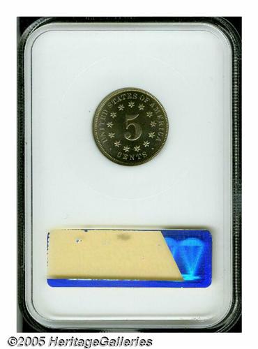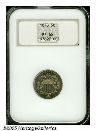 <B>1878<5C> PR65 NGC.</B></I> A well frosted, needle-sharp specimen, virtually untoned on either side. One tiny indention is visible on the 5 on the reverse. Gem quality for this proof-only date.