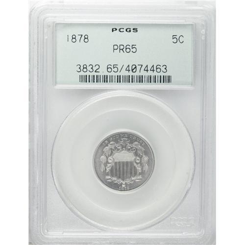 <B>1878 5C PR65 PCGS.</B></I> A bright and untoned specimen, sharply struck and exquisitely preserved. This proof-only issue had a tiny mintage of just 2,350 specimens.<BR><I>From The Cocoa Beach Collection.</B></I><BR><BR><b>Shipping:</b> Coin/Currency (<a target="_blank" href="http://www.heritageauctions.com/common/shipping.php">view shipping information</a>)