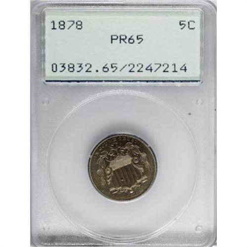 <B>1878 5C PR65 PCGS.</B></I> This well struck proof-only Gem has medium golden-gray toning and refreshingly smooth surfaces. Encased in a first generation holder.<BR><BR><b>Shipping:</b> Coins & Currency (<a target="_blank" href="http://www.heritageauctions.com/common/shipping.php">view shipping information</a>)