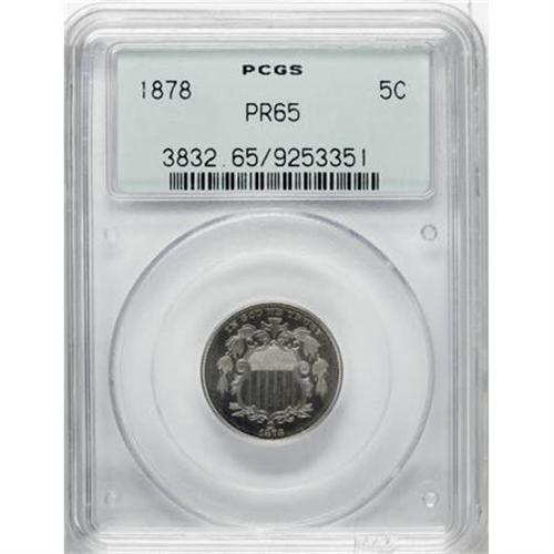 <B>1878 5C PR65 PCGS.</B></I> A solidly struck and enticing Gem representative of this proof-only issue, attractively preserved with periwinkle and green-gold shadings. A marvelous specimen.<BR><BR><B>Coin Engraver:</B> James B. Longacre<BR><BR><b>Shipping:</b> Coins & Currency (<a target="_blank" href="http://www.heritageauctions.com/common/shipping.php">view shipping information</a>)