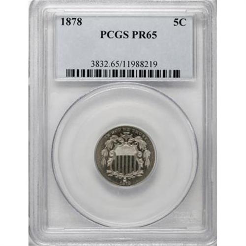 <B>1878 5C PR65 PCGS.</B></I> This light gray Gem proof exhibits strong field-device contrast when the coin is tilted under a light source, particularly on the obverse. Well struck and devoid of mentionable marks.<BR><I>From The John Stimson, Sr. Collection, Part Two.</B></I><BR><BR><B>Coin Engraver:</B> James B. Longacre<BR><BR><b>Shipping:</b> Coins & Currency (<a target="_blank" href="http://www.heritageauctions.com/common/shipping.php">view shipping information</a>)