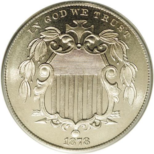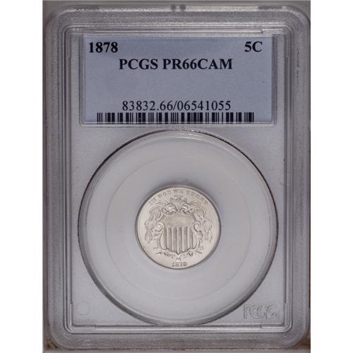 <B>1878<5C> PR66 Cameo PCGS.</B></I> A brilliant Gem that has both reflective and cartwheel luster. Well struck with a nearly pristine obverse. The lower loop of the final 8 in the date has a line of extra metal. A popular proof-only issue that is infrequently offered with Cameo contrast. Population: 12 in 66 as Cameo, 3 finer (1/06).