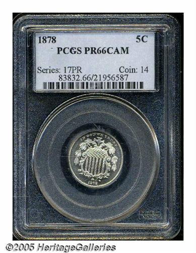 <B>1878<5C> PR66 Cameo PCGS.</B></I> Boldly struck with an inordinate amount of flashiness for this often-lackluster issue. While contrast is barely enough to carry the cameo designation, few could dispute the strong eye appeal displayed by this Premium Gem specimen. Population: 11 in 66, 3 finer (6/05).