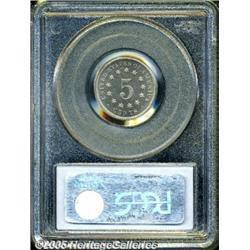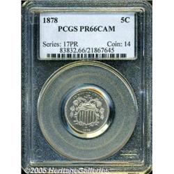 <B>1878 5C PR66 Cameo PCGS.</B></I> The final 8 in the date is lightly recut. Fully struck with bright, untoned surfaces that reveal a pleasing, mild contrast between fields and devices, on both obverse and reverse. A shallow planchet flaw (as struck) rests between the second and third group of vertical shield lines, just above their lower boundary. Well preserved and attractive, and a scarce issue with any Cameo contrast. Population: 8 in 66 Cameo, 5 finer (1/05).