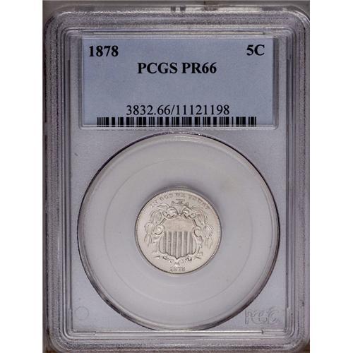 <B>1878<5C> PR66 PCGS.</B></I> A brilliant and beautiful proof-only Premium Gem. The strike is penetrating, and surface flaws are absent. Mintages of Shield nickels were minimal between 1877 and 1881, yet proofs from these dates remain affordable.