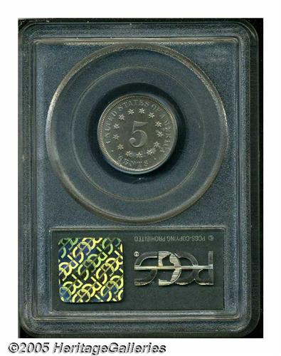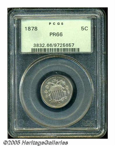 <B>1878<5C> PR66 PCGS.</B></I> Gold-tan and sky-blue patina adheres to each side, being slightly deeper on the obverse. Sharply struck, and no mentionable contact marks. A few tiny greenish spots are noted on the reverse. Population: 119 in 66, 13 finer (6/05).