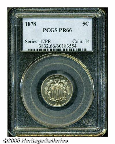 <B>1878<5C> PR66 PCGS.</B></I> The second 8 in the date is recut within the lower loop. Essentially brilliant and void of hairlines or contact marks. An outstanding Premium Gem. Population: 119 in 66, 13 finer (6/05).