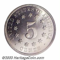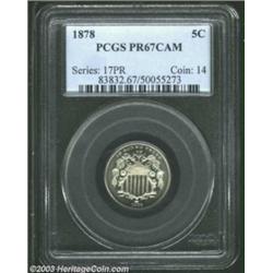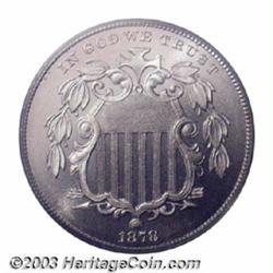 <TABLE cellSpacing=0 cellPadding=0 width="100%" bgColor=#000000 border=0><TBODY><TR><TD width="100%"><TABLE cellSpacing=1 cellPadding=3 width="100%" border=0><TBODY><TR><TD width="100%" bgColor=#79735c><FONT face=arial color=#ffffff size=3><B>Description</B> </FONT></TD></TR><TR><TD width="100%" bgColor=#ffffff><FONT face=arial size=2><B>1878 5C PR67 Cameo PCGS.</B></I> The second 8 in the date is recut within the lower loop. A razor-sharp Superb Gem that is brilliant aside from a hint of tan color on the shield. Exquisitely preserved with good contrast and moderate satin luster. Only proofs were struck in 1878, which was also the case for the other copper-nickel alloy denomination struck that year, the Three Cent Nickel. Population: 2 in 67 as Cameo, none finer (4/03). </FONT></TD></TR></TBODY></TABLE></TD></TR></TBODY></TABLE><BR><A name=PricesRealized></A><TABLE cellSpacing=0 cellPadding=0 width="100%" bgColor=#000000 border=0><TBODY><TR><TD width="100%"><TABLE cellSpacing=1 cellPadding=3 width="100%" border=0><TBODY><TR><TD width="100%" bgColor=#79735c><A name=PR><FONT face=arial color=#ffffff size=3><B>Previous Prices from Heritage Auctions</B> </FONT></A></TD></TR><TR><TD bgColor=#f6f6ed>No Prior Data Recorded </TD></TR><TR><TD bgColor=#ffffff><FONT face=arial size=1 ?>PLEASE NOTE: All prices realized reflect the final hammer price PLUS the buyer's premium in auctions that charge a buyer's premium. Each item has a notation at the top of the listing indicating whether that lot included a buyer's premium. Example: A item that sells with a final hammer price of $100 and a 20% buyer's premium will display with a price realized of $120. All information listed is intended to be as accurate as possible, but errors are possible. Please use this guide carefully and inform us of any inaccuracies. </FONT></TD></TR></TBODY></TABLE></TD></TR></TBODY></TABLE><BR><TABLE cellSpacing=0 cellPadding=0 width="100%" bgColor=#000000 border=0><TBODY><TR><TD width="100%"><TABLE cellSpacing=1 cellPadding=3 width="100%" border=0><TBODY><TR><TD width="100%" bgColor=#79735c colSpan=6><FONT face=arial color=#ffffff size=3><B>Price Guide*</B> </FONT></TD></TR><TR bgColor=#f6f6ed><TD align=middle><B>Grade</B> </TD><TD align=middle><B>Coin World<BR>(Trends)</B> </TD><TD align=middle><B>Numismedia<BR>Retail</B> </TD><TD align=middle><B>Numismedia<BR>Wholesale</B> </TD><TD align=middle><B>Coin<BR>Universe</B> </TD><TD align=middle><B>Heritage<BR>Value Index</B> </TD></TR><TR bgColor=#ffffff><TD align=middle>66</TD><TD align=right>---</TD><TD align=right>---</TD><TD align=right>---</TD><TD align=right>---</TD><TD align=right>---</TD></TR><TR style="FONT-WEIGHT: bold" bgColor=#cccfdd><TD align=middle>67</TD><TD align=right>---</TD><TD align=right>---</TD><TD align=right>---</TD><TD align=right>---</TD><TD align=right>---</TD></TR><TR bgColor=#ffffff><TD align=middle>68</TD><TD align=right>---</TD><TD align=right>---</TD><TD align=right>---</TD><TD align=right>---</TD><TD align=right>---</TD></TR><TR bgColor=#ffffff><TD colSpan=6><FONT size=1>*All information listed is intended to be as accurate as possible, but errors are possible. No item may be returned or refused based on this information which is provided as a service to our customers. You should contact each pricing source directly to determine the accuracy of this information. </FONT></TD></TR></TBODY></TABLE></TD></TR></TBODY></TABLE><BR><TABLE cellSpacing=0 cellPadding=0 width="100%" bgColor=#000000 border=0><TBODY><TR><TD width="100%"><TABLE cellSpacing=1 cellPadding=3 width="100%" border=0><TBODY><TR><TD width="100%" bgColor=#79735c><FONT face=arial color=#ffffff size=3><B>Population Guide</B> </FONT></TD></TR><TR bgColor=#ffffff><TD align=middle><!-- Begin Output of Population Grid--><TABLE cellSpacing=0 cellPadding=0 width="100%" border=0><TBODY><TR><TD vAlign=center><TABLE cellSpacing=0 width="100%" border=1 cellsadding="3"><TBODY><TR><TD vAlign=center><TABLE cellSpacing=0 cellPadding=3 width="100%" border=1><TBODY><TR><TD vAlign=center align=middle bgColor=#f0f1e8 colSpan=2 <CENTER><FONT face=Arial size=2><B>PCGS Pop </B></FONT><CENTER></CENTER></TD><TD vAlign=center align=middle bgColor=#f0f1e8 colSpan=2><CENTER><FONT face=Arial size=2><B>NGC Pop</B></CENTER></FONT></TD></TR><TR><TD vAlign=center><FONT face=Arial size=2>(67)</FONT> </TD><TD vAlign=center align=right><FONT face=Arial size=2>1</FONT> </TD><TD vAlign=center><FONT face=Arial size=2>(67)</FONT> </TD><TD vAlign=center align=right><FONT face=Arial size=2>0</FONT> </TD></TR><TR><TD vAlign=center><FONT face=Arial size=2>(>67)</FONT> </TD><TD vAlign=center align=right><FONT face=Arial size=2>0</FONT> </TD><TD vAlign=center><FONT face=Arial size=2>(>67)</FONT> </TD><TD vAlign=center align=right><FONT face=Arial size=2>0</FONT> </TD></TR></TBODY></TABLE></TD></TR></TBODY></TABLE></TD></TR></TBODY></TABLE><!-- End Output of Population Grid--> Important notice: Heritage usually auctions material at the rate of 200-250 lots per hour. On some occasions eBay Live bid software or the Internet may not be able to keep up with the pace of the auction. We recommend placing a realistic absentee bid now as insurance to avoid disappointment. Occasionally the auctioneer may eliminate or reject an eBay Live bid, and the auctioneer may also reopen a lot after the close of the eBay live bidding (usually because we missed an audience bid), and may reject your bid even if it shows you as the winning bidder. By bidding via eBay Live, you agree that Heritage may award the lot to another bidder at its sole discretion under the circumstances described above or any other reasonable circumstances. Also please note that all Heritage lots purchased through eBay Live carry a 20% Buyer's Premium. Please make sure you read the Terms and Conditions before you bid.</TD></TR></TBODY></TABLE></TD></TR></TBODY></TABLE>