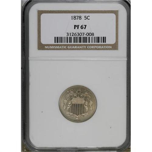 <B>1878 5C PR67 NGC.</B></I> The quality of strike jumps out at the viewer of this Superb Gem proof nickel, as all design elements are sharply and uniformly delineated. Hints of light tan are visible under magnification, and well preserved surfaces yield strong field-motif contrast when the coin is tilted slightly under a light source. A tiny fleck in the left obverse field is mentioned for complete accuracy. Census: 19 in 67, 0 finer (1/08).<BR><BR><B>Coin Engraver:</B> James B. Longacre<BR><BR><b>Shipping:</b> Coins & Currency (<a target="_blank" href="http://www.heritageauctions.com/common/shipping.php">view shipping information</a>)