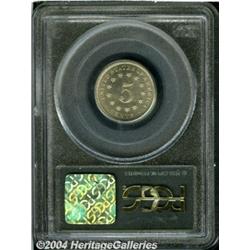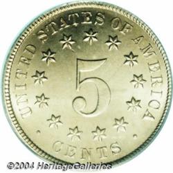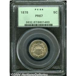 <B>1878<5C> PR67 PCGS.</B></I> An extraordinary example of this rare, low mintage issue in the Shield Nickel series. Only 2,350 pieces were produced, all proofs, and while many have the shallowly mirrored fields seen on this piece, few are as clean and problem-free. Pale rose-gray patina shows overall. Population: 13 in 67, none finer at either service (7/04). <BR><BR><B>Important notice:</B> Heritage usually auctions material at the rate of 200-250 lots per hour. On some occasions eBay Live bid software or the Internet may not be able to keep up with the pace of the auction. We recommend placing a realistic absentee bid now as insurance to avoid disappointment. Occasionally the auctioneer may eliminate or reject an eBay Live bid, and the auctioneer may also reopen a lot after the close of the eBay live bidding (usually because we missed an audience bid), and may reject your bid even if it shows you as the winning bidder. By bidding via eBay Live, you agree that Heritage may award the lot to another bidder at its sole discretion under the circumstances described above or any other reasonable circumstances. Since eBay bids are not shown to us until we open the lot on the floor, we treat those bids just like floor bids. In most cases the floor responds before the eBay bid is presented to us, due to Internet lag time, so for consistency we have made it a policy that floor bids are always considered first over tie eBay live bids. Also please note that all Heritage lots purchased through eBay Live carry a 20% Buyer's Premium. Please make sure you read the Terms and Conditions before you bid. </span></font></tr></table></td></tr></table>