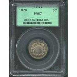 <TABLE cellSpacing=0 cellPadding=0 width="100%" bgColor=#000000 border=0><TBODY><TR><TD width="100%"><TABLE cellSpacing=1 cellPadding=3 width="100%" border=0><TBODY><TR><TD width="100%" bgColor=#79735c><FONT face=arial color=#ffffff size=3><B>Description</B> </FONT></TD></TR><TR><TD width="100%" bgColor=#ffffff><FONT face=arial size=2><B>1878 5C PR67 PCGS.</B></I> Beautiful bands of apple-green, ruby-red, and gold patina provide impressive eye appeal. A sharply struck Superb Gem with nearly undisturbed surfaces. The second 8 in the date is lightly recut inside the lower loop. Like the Three Cent Nickel of the same date, the 1878 Nickel is the second of two consecutive proof-only issues in the series. It can be located without much difficulty in PR64 to PR65 grades, but few specimens can match the eye appeal of the present piece. Housed in an older green label PCGS holder. Population: 13 in 67, 0 finer (4/03). </FONT></TD></TR></TBODY></TABLE></TD></TR></TBODY></TABLE><BR><A name=PricesRealized></A><TABLE cellSpacing=0 cellPadding=0 width="100%" bgColor=#000000 border=0><TBODY><TR><TD width="100%"><TABLE cellSpacing=1 cellPadding=3 width="100%" border=0><TBODY><TR><TD width="100%" bgColor=#79735c><A name=PR><FONT face=arial color=#ffffff size=3><B>Previous Prices from Heritage Auctions</B> </FONT></A></TD></TR><TR><TD bgColor=#f6f6ed><TABLE cellSpacing=0 cellPadding=0 width="100%" border=1><TBODY><TR><TD align=middle width="33%"><B>Date</B></TD><TD align=middle width="33%"><B>Service</B></TD><TD align=middle width="33%"><B>Price</B></TD></TR><TR bgColor=whitesmoke><TD width="33%"><B>02/01/2001</B></TD><TD width="33%">PCGS</TD><TD width="33%">$2,300.00</TD></TR><TR bgColor=whitesmoke><TD width="33%"><B>01/08/1999</B></TD><TD width="33%">PCGS</TD><TD width="33%">$1,840.00</TD></TR><TR bgColor=whitesmoke><TD width="33%"><B>08/01/1999</B></TD><TD width="33%">PCGS</TD><TD width="33%">$1,668.00</TD></TR><TR bgColor=whitesmoke><TD width="33%"><B>03/01/1999</B></TD><TD width="33%">PCGS</TD><TD width="33%">$1,668.00</TD></TR><TR bgColor=whitesmoke><TD width="33%"><B>03/01/2003</B></TD><TD width="33%">PCGS</TD><TD width="33%">$3,795.00</TD></TR></TBODY></TABLE></TD></TR><TR><TD bgColor=#ffffff><FONT face=arial size=1 ?>PLEASE NOTE: All prices realized reflect the final hammer price PLUS the buyer's premium in auctions that charge a buyer's premium. Each item has a notation at the top of the listing indicating whether that lot included a buyer's premium. Example: A item that sells with a final hammer price of $100 and a 20% buyer's premium will display with a price realized of $120. All information listed is intended to be as accurate as possible, but errors are possible. Please use this guide carefully and inform us of any inaccuracies. </FONT></TD></TR></TBODY></TABLE></TD></TR></TBODY></TABLE><BR><TABLE cellSpacing=0 cellPadding=0 width="100%" bgColor=#000000 border=0><TBODY><TR><TD width="100%"><TABLE cellSpacing=1 cellPadding=3 width="100%" border=0><TBODY><TR><TD width="100%" bgColor=#79735c colSpan=6><FONT face=arial color=#ffffff size=3><B>Price Guide*</B> </FONT></TD></TR><TR bgColor=#f6f6ed><TD align=middle><B>Grade</B> </TD><TD align=middle><B>Coin World<BR>(Trends)</B> </TD><TD align=middle><B>Numismedia<BR>Retail</B> </TD><TD align=middle><B>Numismedia<BR>Wholesale</B> </TD><TD align=middle><B>Coin<BR>Universe</B> </TD><TD align=middle><B>Heritage<BR>Value Index</B> </TD></TR><TR bgColor=#ffffff><TD align=middle>66</TD><TD align=right>$1,300.00</TD><TD align=right>---</TD><TD align=right>$885.00</TD><TD align=right>$1,200.00</TD><TD align=right>$833.33</TD></TR><TR style="FONT-WEIGHT: bold" bgColor=#cccfdd><TD align=middle>67</TD><TD align=right>---</TD><TD align=right>---</TD><TD align=right>$1,800.00</TD><TD align=right>$3,250.00</TD><TD align=right>$2,275.00</TD></TR><TR bgColor=#ffffff><TD align=middle>68</TD><TD align=right>---</TD><TD align=right>---</TD><TD align=right>---</TD><TD align=right>---</TD><TD align=right>---</TD></TR><TR bgColor=#ffffff><TD colSpan=6><FONT size=1>*All information listed is intended to be as accurate as possible, but errors are possible. No item may be returned or refused based on this information which is provided as a service to our customers. You should contact each pricing source directly to determine the accuracy of this information. </FONT></TD></TR></TBODY></TABLE></TD></TR></TBODY></TABLE><BR><TABLE cellSpacing=0 cellPadding=0 width="100%" bgColor=#000000 border=0><TBODY><TR><TD width="100%"><TABLE cellSpacing=1 cellPadding=3 width="100%" border=0><TBODY><TR><TD width="100%" bgColor=#79735c><FONT face=arial color=#ffffff size=3><B>Population Guide</B> </FONT></TD></TR><TR bgColor=#ffffff><TD align=middle><!-- Begin Output of Population Grid--><TABLE cellSpacing=0 cellPadding=0 width="100%" border=0><TBODY><TR><TD vAlign=center><TABLE cellSpacing=0 width="100%" border=1 cellsadding="3"><TBODY><TR><TD vAlign=center><TABLE cellSpacing=0 cellPadding=3 width="100%" border=1><TBODY><TR><TD vAlign=center align=middle bgColor=#f0f1e8 colSpan=2 <CENTER><FONT face=Arial size=2><B>PCGS Pop </B></FONT><CENTER></CENTER></TD><TD vAlign=center align=middle bgColor=#f0f1e8 colSpan=2><CENTER><FONT face=Arial size=2><B>NGC Pop</B></CENTER></FONT></TD></TR><TR><TD vAlign=center><FONT face=Arial size=2>(67)</FONT> </TD><TD vAlign=center align=right><FONT face=Arial size=2>13</FONT> </TD><TD vAlign=center><FONT face=Arial size=2>(67)</FONT> </TD><TD vAlign=center align=right><FONT face=Arial size=2>14</FONT> </TD></TR><TR><TD vAlign=center><FONT face=Arial size=2>(>67)</FONT> </TD><TD vAlign=center align=right><FONT face=Arial size=2>0</FONT> </TD><TD vAlign=center><FONT face=Arial size=2>(>67)</FONT> </TD><TD vAlign=center align=right><FONT face=Arial size=2>0</FONT> </TD></TR></TBODY></TABLE></TD></TR></TBODY></TABLE></TD></TR></TBODY></TABLE><!-- End Output of Population Grid--> Important notice: Heritage usually auctions material at the rate of 200-250 lots per