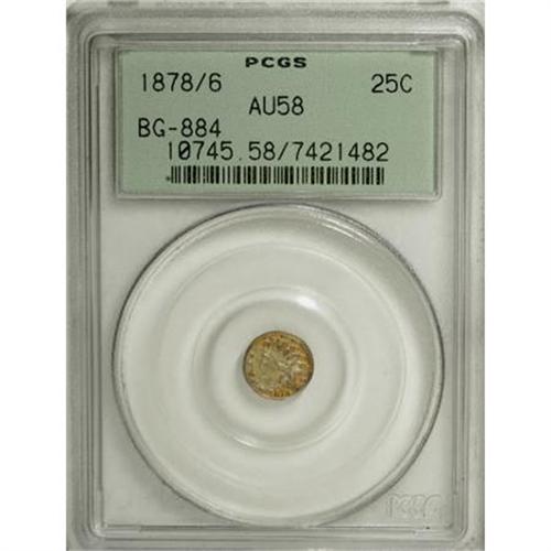 <B>1878/6 25C Indian Round 25 Cents, BG-884, High R.5, AU58 PCGS.</B></I> From the same die pair as BG-881, but the maker has crudely changed the 6 in the date into an 8. The lustrous lemon-gold and aquamarine surfaces are faintly hairlined. Housed in an old green label holder.<BR><BR><b>Shipping:</b> Coins & Currency (<a target="_blank" href="http://www.heritageauctions.com/common/shipping.php">view shipping information</a>)