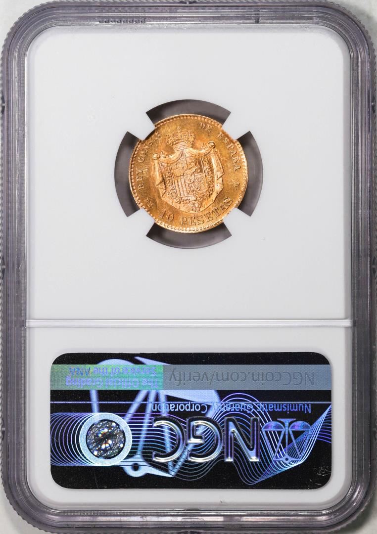 One 1878(62) Dem Spain 10 Pesetas NGC MS67 Restrike. NGC Certified.